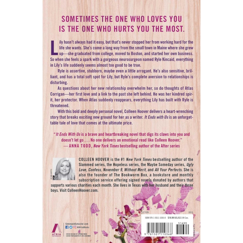 "It Ends with Us" by Colleen Hoover is a contemporary romance novel that follows Lily Bloom's complex relationship with neurosurgeon Ryle Kincaid. The story delves into sensitive themes, addressing difficult choices and the strength needed to break cycles. Colleen Hoover's narrative is emotional and thought-provoking, offering a compelling exploration of love and resilience.